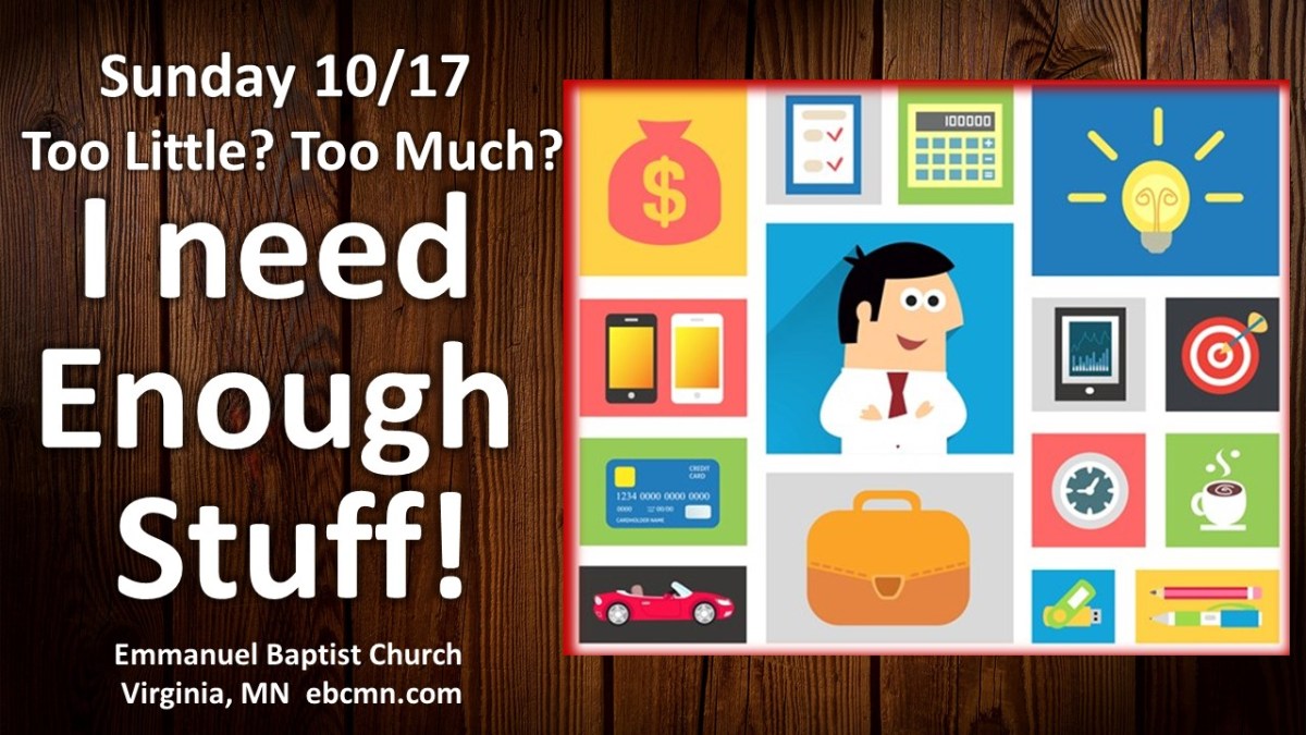 In this life we are surrounded by a million opportunities to buy stuff but are often frustrated that we can’t have much of it because we don’t have the millions of dollars needed to get it. Some of us have too much stuff and some of us really do need more stuff. The stuff you choose to purchase, keep, give away and throw away can define the kind of life you live. I have met millionaires who appeared poor and poor people deep in debt trying to appear to be millionaires. The Bible has a lot to say about money and possessions, including Paul instructing Timothy, “Yet true godliness with contentment is itself great wealth…. For the love of money is the root of all kinds of evil. And some people, craving money, have wandered from the true faith and pierced themselves with many sorrows.” 1 Timothy 6:6,10. Don’t spend your life trying to find contentment apart from God! Come be encouraged this Sunday at Emmanuel Baptist Church to worship God with the stuff He provides for you and to gain a right perspective on the temporary finances flowing in and out of your life.